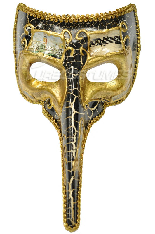 Baroque Musical Nasone Mask (Black) includes elegant long nose Venetian half mask raised gold embossed detailing image decorations on forehead and cheekbone area and black ribbon ties for comfortable wear.
