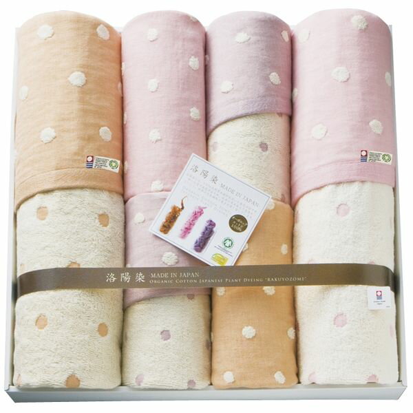 オーガニックコットンを天然草木染料で染め、今治で丁寧に織り上げた高級タオルです。京都の染工場と京都市産業技術研究所の共同開発により、従来より色落ちの少ない草木染を実現しました。また、素材から染めるので、製品染めでは出せない深い色合いも洛陽染の特徴です。●現品:バスタオル・フェイスタオル・ウォッシュタオル×各2●材質:綿100%(オーガニックコットン100%)●機能・特長:made in JAPAN●サイズ:バスタオル:60×120cm、フェイスタオル:34×78cm、ウォッシュタオル:34×35cm●箱サイズ:44×45×8cm