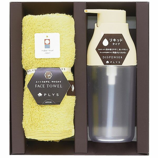 ディスペンサーは、シャンプーやリンスの詰め替え液を入れて使用できます。口も広いので詰め替えしやすいです。下部分が半透明なので残りの量もわかりやすく、底がすり鉢状になっているので最後までしっかり使えます。●材質:ディスペンサーリキッド:(本体)PET、(蓋)ポリプロピレン、(ポンプ)ポリプロピレン・ポリエチレン、(パッキン)シリコン、タオル:綿100%●※注釈:※こちらの商品は、デザインの都合上、のし紙・包装はおかけできませんのでご了承ください。●サイズ:ディスペンサーリキッド:Φ8×21.5cm(420ml)、フェイスタオル:34×77cm●箱サイズ:25.5×23×9.5cm